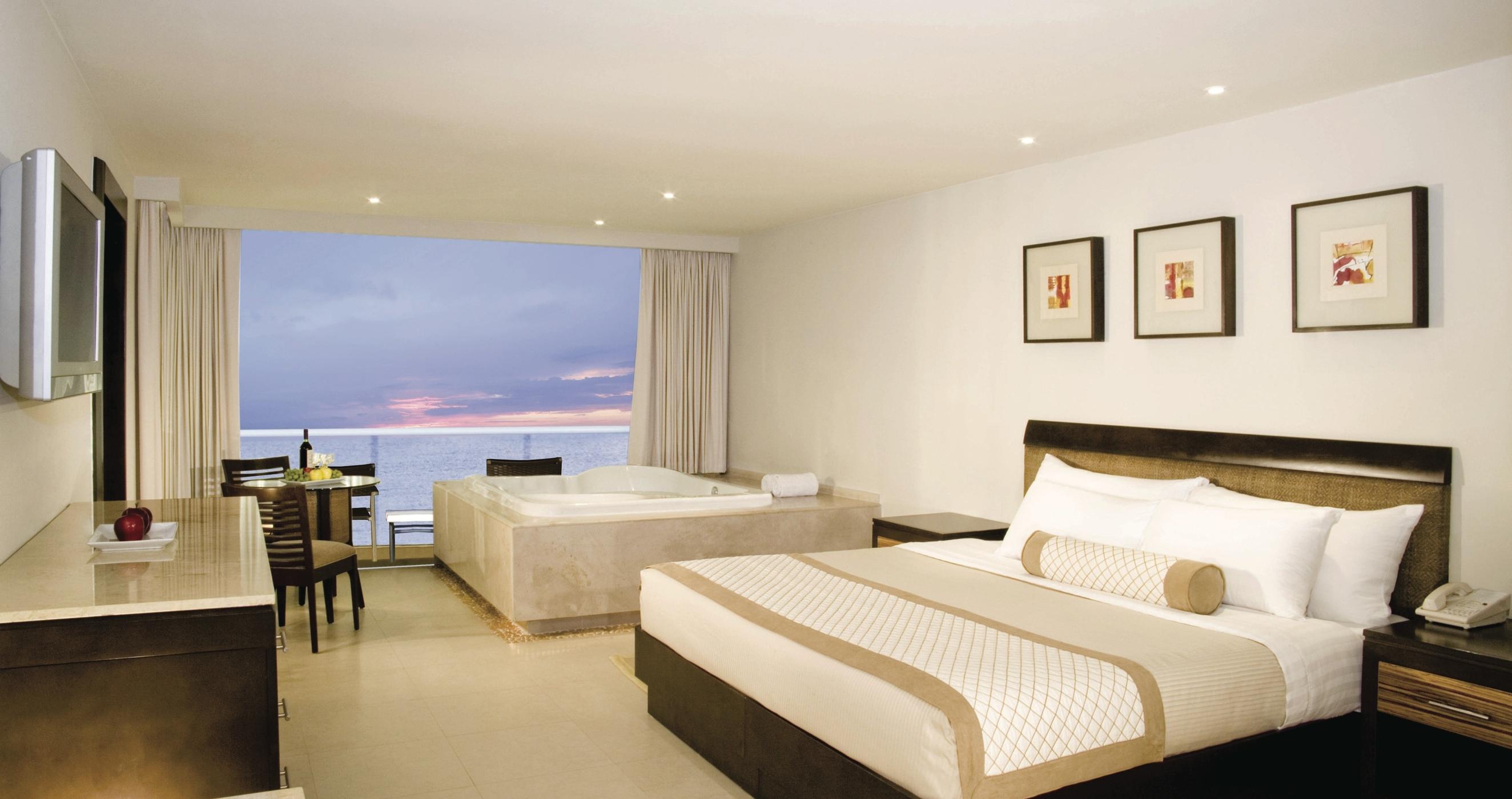The 601 rooms feature fabrics in creamy hues and light colour walls and floors. Here a standard amenity means a double Jacuzzi®, flat screen LCD TV with satellite, turndown service, liquor dispenser, and bathrobes and slippers. But the most important amenity of all: the ocean view included in most of the rooms.